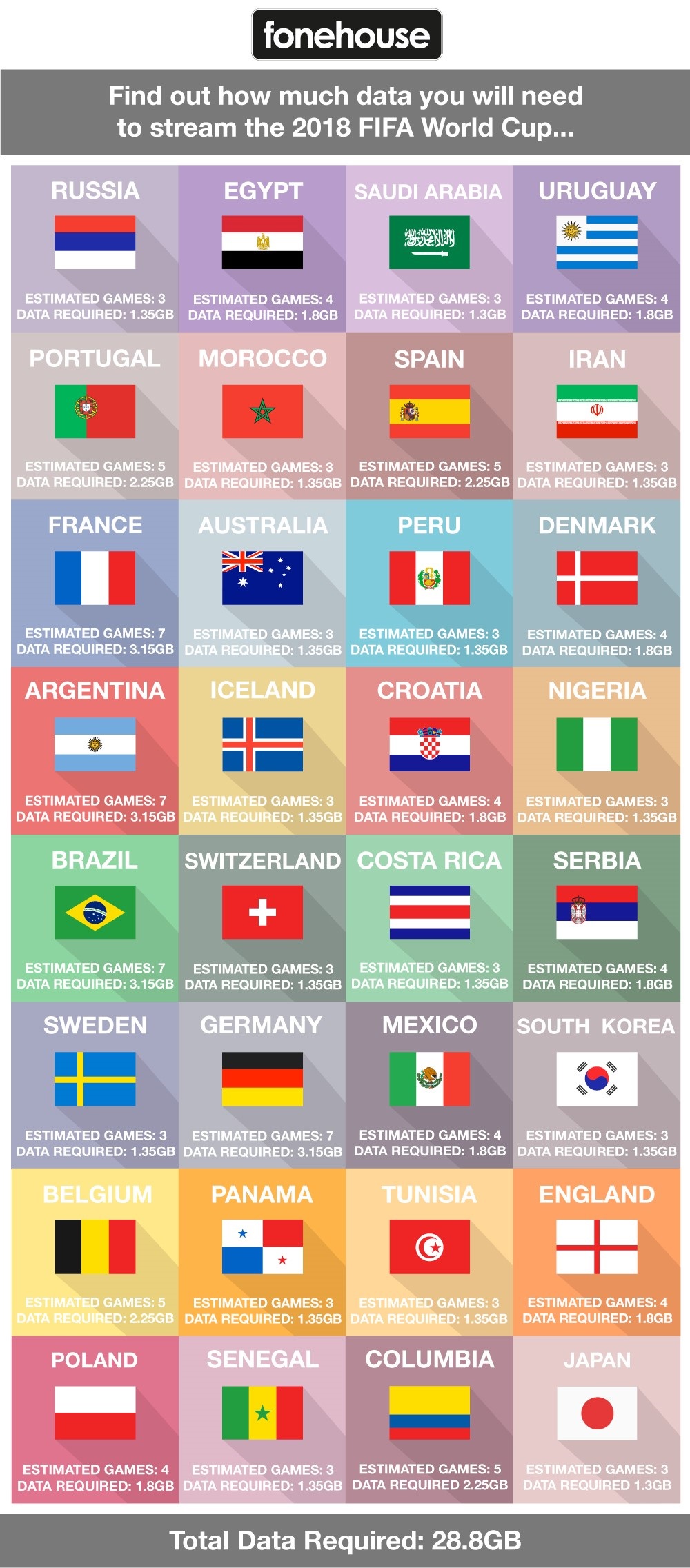 According to a new study by smartphone retailer Fonehouse, Russia 2018 could cost you a whopping 28.8GB of your data allowance to watch all the games on the move. Since lots of games are at awkward work times, the company decided to find out just how much data games viewed exclusively on your smartphone would take up.
